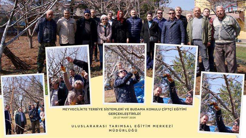 Uluslararası Tarımsal Eğitim Merkezi Müdürlüğü (UTEM) tarafından çiftçilere yönelik olarak düzenlenen “Meyvecilikte Terbiye Sistemleri ve Budama" konulu çiftçi eğitimi, 25-27 Mart 2026 tarihleri arasında gerçekleştirildi. Eğitim, Ziraat Mühendisi M. Zeki İLGEN tarafından verildi.